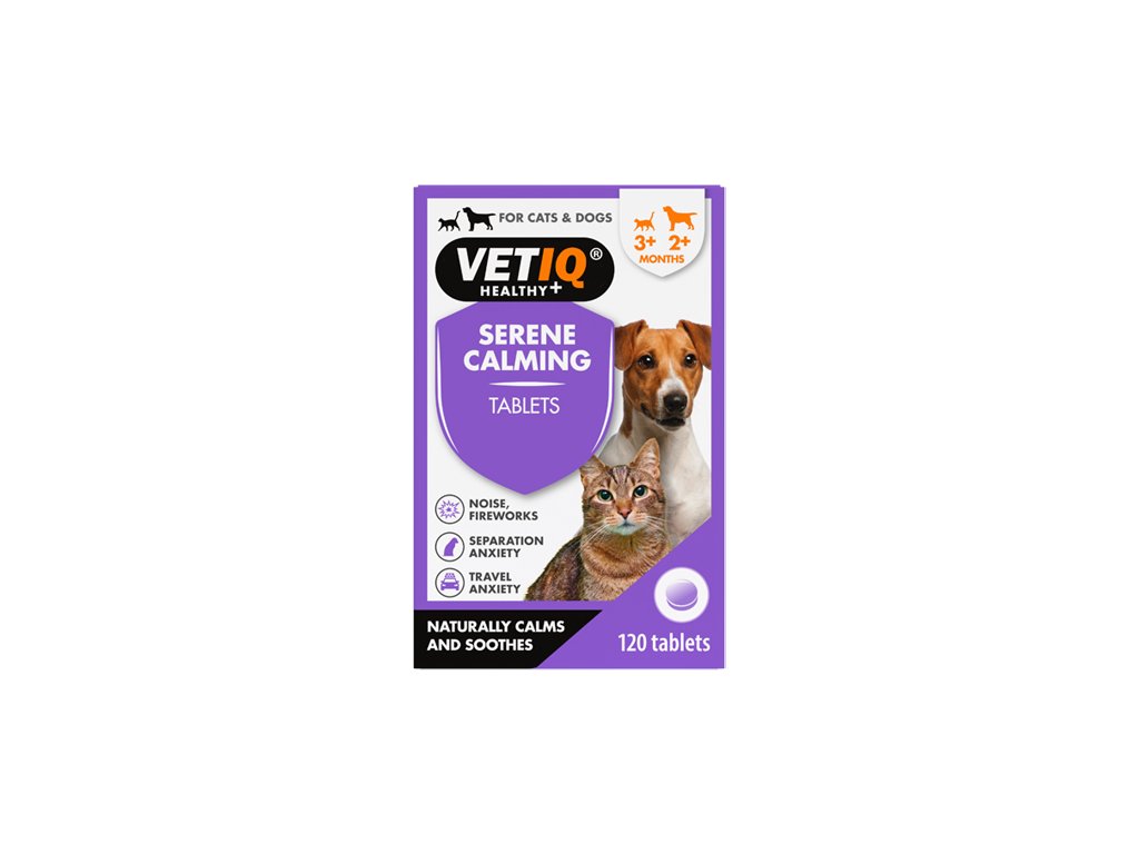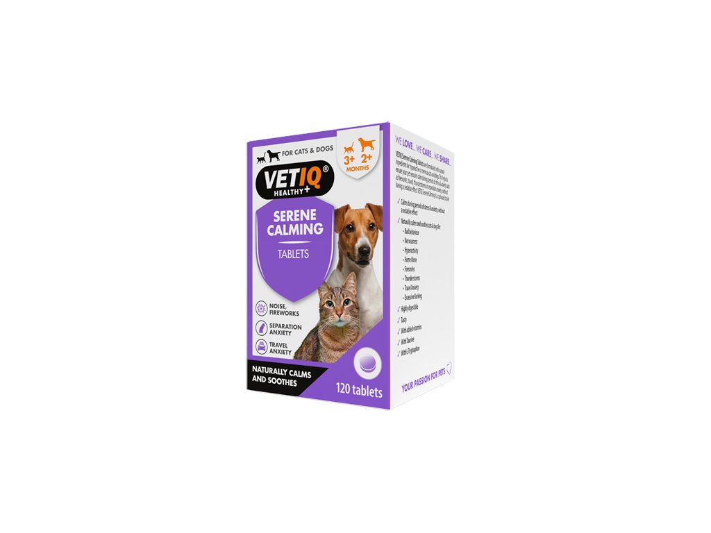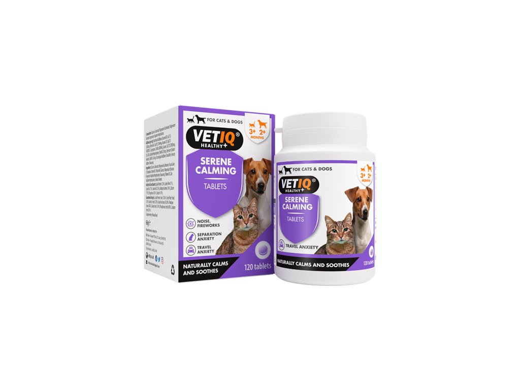 • zklidňuje a utišuje zvířata v době silného stresu (sám doma, ohňostroj, výstavy) • pomáhá zklidnit nervózní, bojácné nebo agresivní kočky, psy a jiná zvířata • pomáhá při depresích, úzkosti, strachu a poruchách spánku • pomáhá při odstraňování zlozvyků (nutkavé chození, štěkání, ohryzávání předmětů, lízání pacek, značkování) • zcela přírodní, bez vedlejších účinků, nenávykové Použití: Rozdrťte tabletu a přidejte do krmiva. Pokud je to možné, podejte tabletu v celku. Je nezbytné začít podávání Serene tablety 24-36hodin před očekávanou událostí, aby se maximalizoval účinek přípravku. Lze podávat dlouhodobě - několik měsíců až rok - do vymizení příznaků stresu. Dávkování: Váha Množství Četnost do 2,5 kg 1/4 tbl 2× denně do 5 kg 1/2 tbl 2× denně 5-10 kg 1 tbl 2× denně 10-20 kg 2 tbl 2× denně U štěňat a koťat ve věku od 8 týdnů do 6 měsíců aplikujte polovinu doporučeného množství v závislosti na váze štěněte. Složení: uhličitan vápenatý, uhličitan hořečnatý, stearát hořečnatý, heptahydrát síranu hořečnatého Analytické složky: protein 12,4%, hrubá vláknina 0,1%, tuky a oleje 1,75%, vlhkost 3,4%, hrubý popel 57,6% Doplňkové látky: technologické: emulgátory, senzorické: příchuť, nutriční: Vitamin B3 33000mg, Vitamin B6 21449mg, Vitamin D3 180000IU, L-tryptofan 62800mg, Taurin 20000mg, zinek (sulfát) 250mg, seleničitan (seleničitan sodný) 0,45 mg Balení: 120 tbl (plastová dóza)